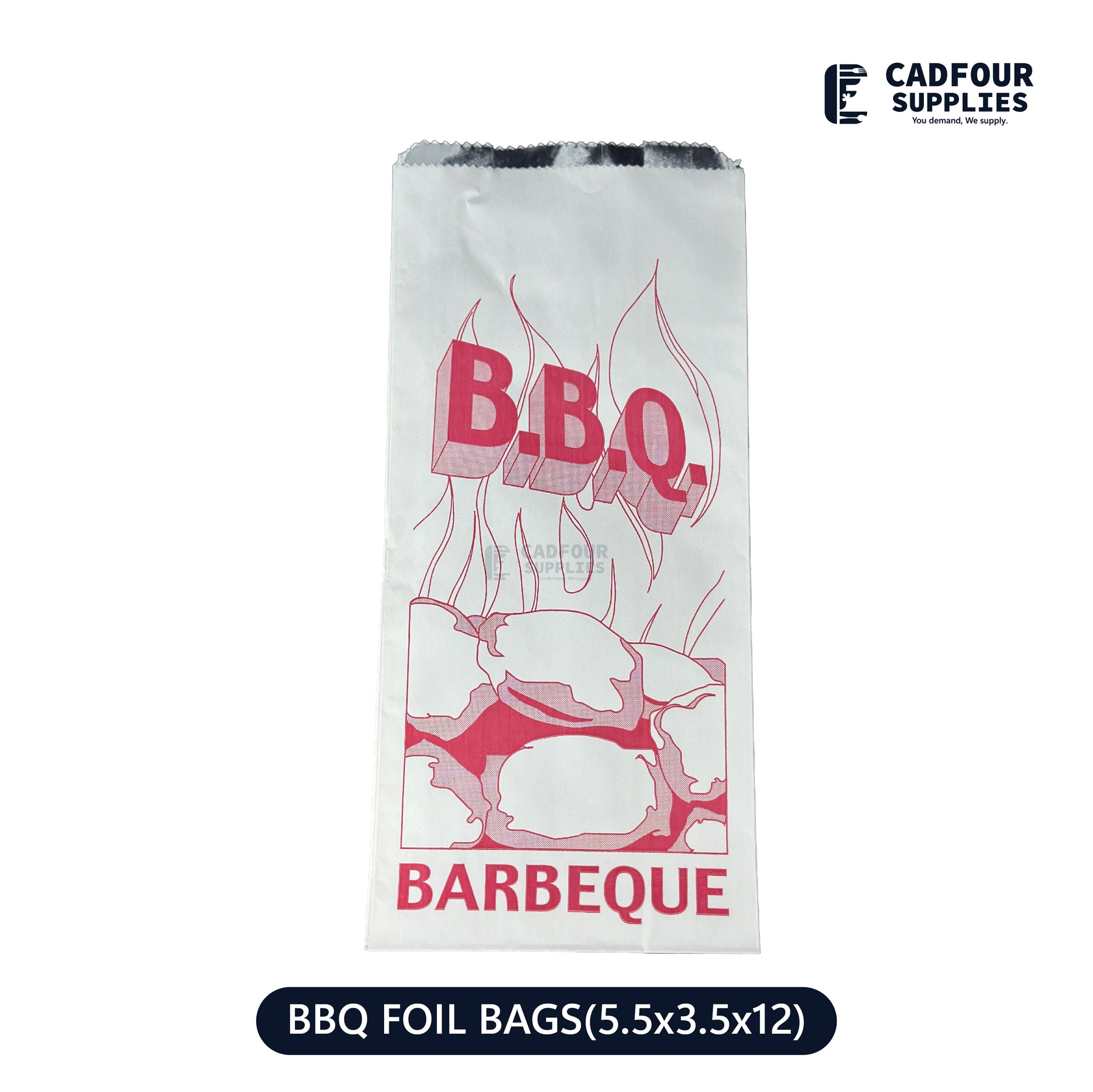 Heat-resistant BBQ foil bags (5.5x3.5x12) ideal for grilled meats, kebabs, and takeout. Keeps food hot and juicy while preventing leaks.