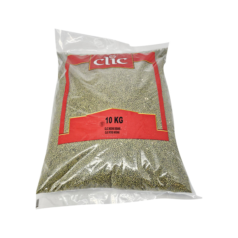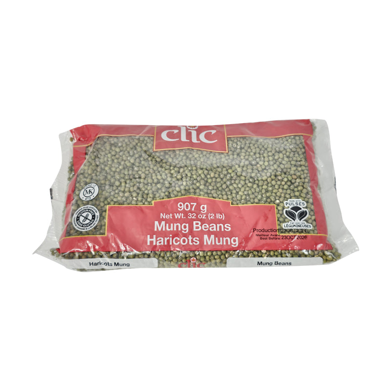 A 2-pound bag of CLIC Moong Beans (Mung Beans). These small green beans are versatile for sprouting or cooking in soups and curries.