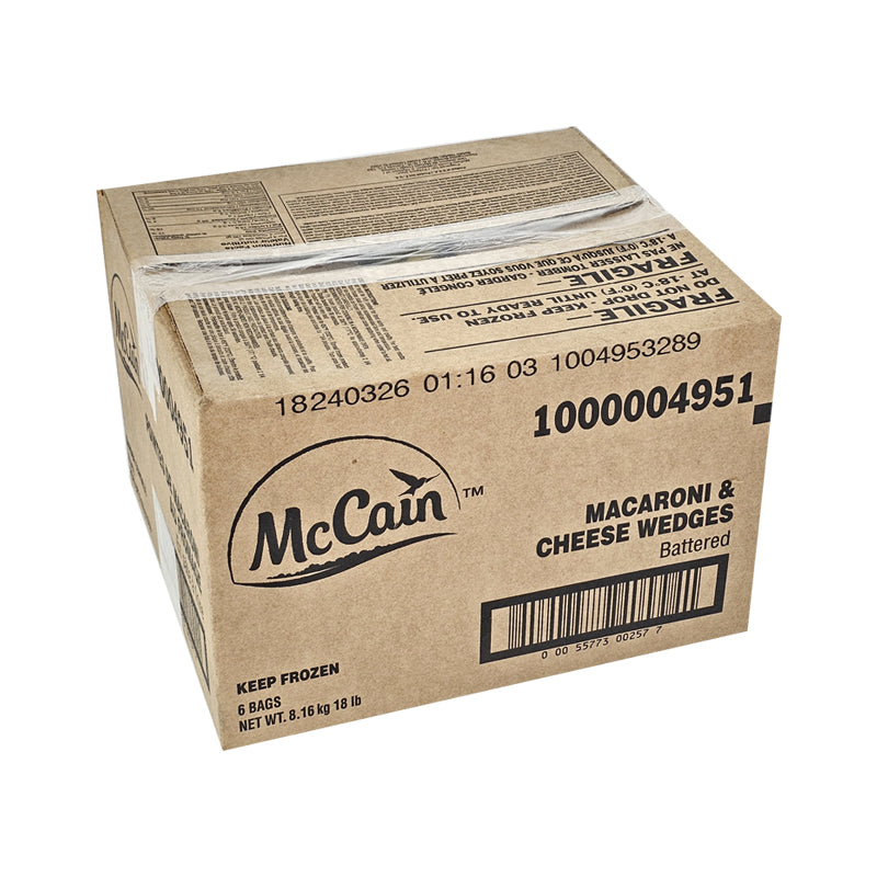 A 3lb bag of McCain Mac & Cheese Wedges. A unique and crowd-pleasing appetizer featuring creamy macaroni and cheese battered and fried.